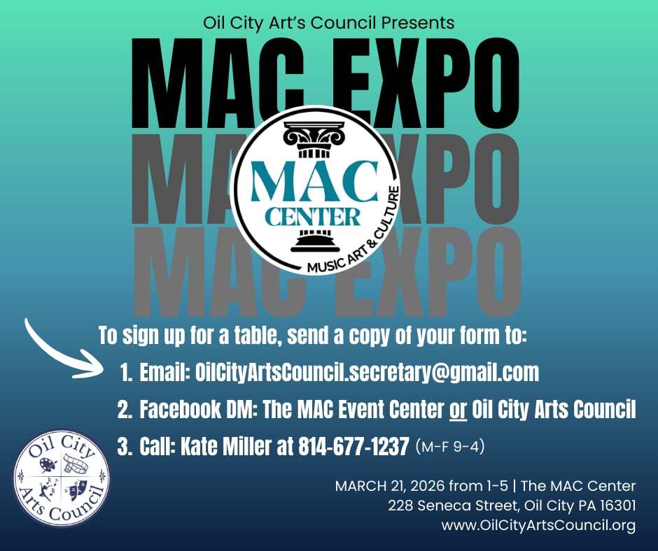 The Oil City Arts Council (OCAC) is a nonprofit organization dedicated to increasing the visibility of community cultural institutions and organizations and facilitating the development of community artists. Our purpose is to promote and foster the public interest and appreciation of all the arts. In seeking to support the arts, the Oil City Arts Council will endeavor to promote dance, theater, music, films and video, creative writing, poetry, painting, sculpture, and other forms of the visual arts. To this end, the OCAC will organize, sponsor, and facilitate concerts, lectures, and workshops for the benefit of the entire Oil City Community and the Oil Region – children, young adults, families, and seniors.